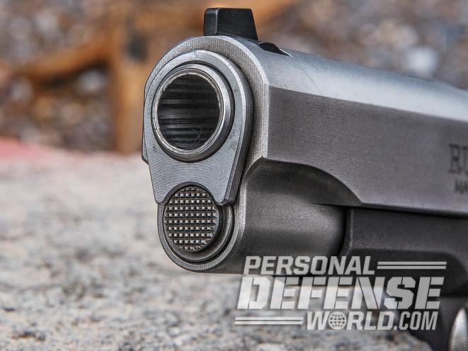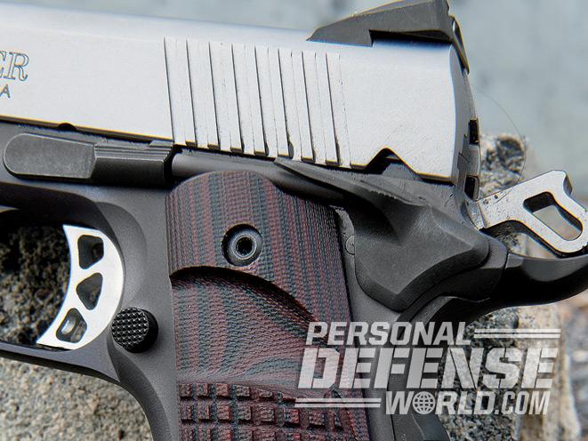Ruger’s Lightweight Commander starts with a lightweight anodized aluminum frame that uses a polished titanium feed ramp. Precision CNC machining provides for excellent slide-to-frame fit as well as solid construction. Serrations on the frontstrap and a checkered metal mainspring housing provide for a solid hold. Series 70 internals keep the aluminum trigger crisp. An oversized beavertail ensures positive function. An integral plunger (not staked) keeps the thumb safety in place, crisp and consistent. Magazines are released using a slightly oversized release and the slide stop is serrated. Thin hardwood grips fit small hands and keep the pistol solid in the user’s grip.