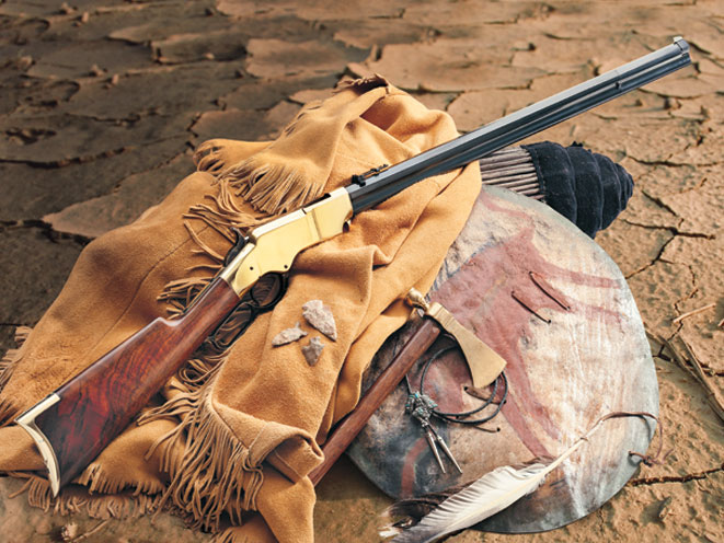 The Henry’s barrel and magazine tube are milled out of a single bar of steel, making it a heavy rifle. The replica weighs in at 9 pounds, about 1.75 pounds heavier than a comparably barreled Winchester 1873.