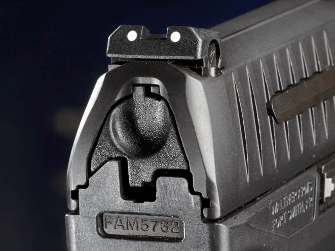 The PPQ M2’s sights were interesting. The rear sight is adjustable for windage only, and the front is adjustable for elevation via a replacement post. Be sure yours is steel, not plastic; I got the steel front sight with a green fiber-optic insert, and it provided an excellent sight picture. Replacing the front sight is easy: Take off the slide, undo the old one from under the top of the slide, and insert and tighten the replacement.