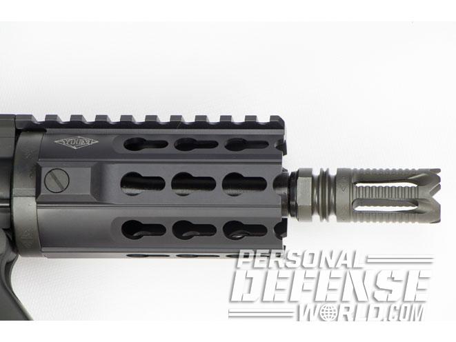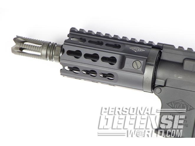 The barrel is made of 4140 steel and has a Melonite QPQ finish. YHM threaded the barrel and topped it with the Phantom 5C2 flash suppressor and compensator. This muzzle device has five ports to reduce the flash signature, but none face downward, which helps avoid kicking up dirt when firing from prone.