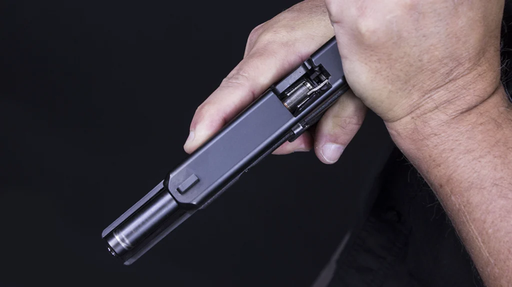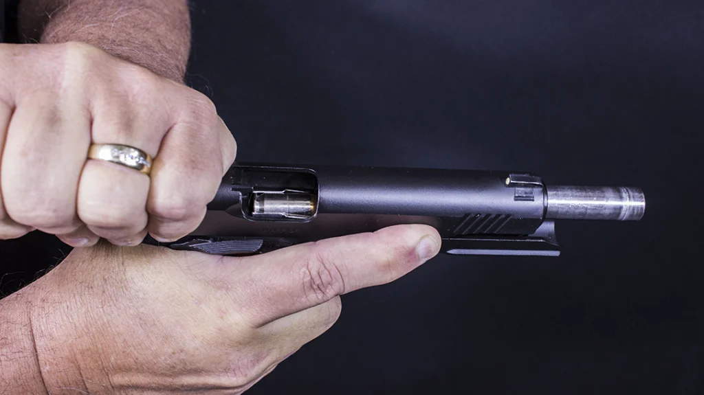 Now, have the gun in front of your chest at a comfortable distance (your “workspace”), and tilt the mag well towards the hand that has the magazine. Move your magazine towards the mag well of the pistol and guide it in with your index finger. Once it’s going into the mag well, move your index and firmly push the magazine into the pistol. You will feel and hear a click once the magazine is seated. Next up is to rack the slide and chamber the first round. Hold the grip with your dominant hand and cup the slide near the rear firmly. At the same time, push the grip forward and pull the slide back. Once the slide comes all the way back, release the slide and your pistol is now ready to fire.