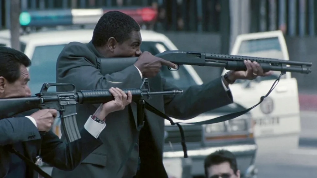 By contrast, the LAPD, including Detective Casals, Detective Mike Bosko (Ted Levine), and Detective Schwartz (Jerry Trimble) – as well as some SWAT officers – are seen armed with M16A1 assault rifles. The presence of the M16A1 is notable, as the rifle may not have been as widely available to the LAPD as the film suggests.