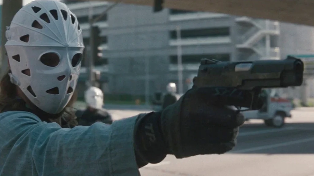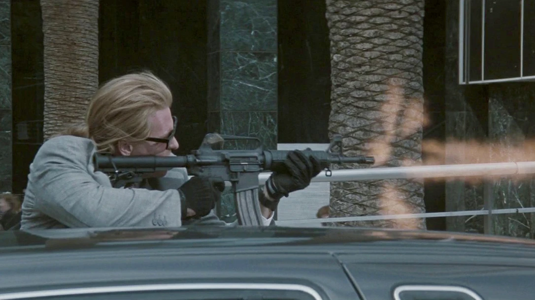 Heat is now remembered for its intense 10-minute long shootout following the bank robbery on the streets of downtown Los Angeles. It featured a mix of long guns, notably a Colt Model 654, which McCauley first used during the armored car heist, while his partner Chris Shiherlis (Val Kilmer) carried a Colt Model 733. Both men carry the latter gun during the bank robbery.