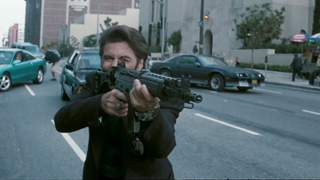 In the downtown shootout, Hanna is armed with an FN FNC, a rifle weapon that the LAPD never used. This was likely made to allow Pacino to stand out. Mann instructed Al Pacino, along with all the actors who played members of the LAPD, to fire only on semi-automatic, as the police would be concerned about the possibility of shooting an innocent bystander.