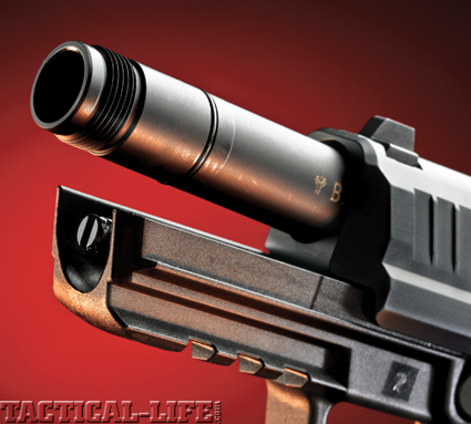 One of the most desirable features on the HK45CT is its very good accuracy, which in large part is due to a high-temperature rubber O-ring that fits into a groove in the barrel about 0.33 inches from the muzzle. This ring keeps the barrel-slide lockup consistent and tight, and is used on all of HK’s .45-caliber suppressor-ready pistols, as well as the competition Elite model. A thread protector is missing from the package, which would be handy given the fine thread pitch used.
