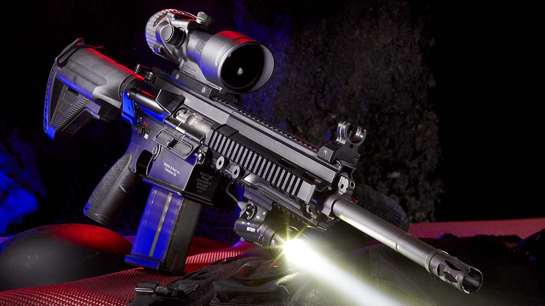 The MR762A1 is a direct descendent of the HK416/417. As such, it features an adjustable buttstock; ergonomic pistol grip; mechanical sights; and either the HK modular rail system or the HK free-floating four-quadrant rail system/handguard.