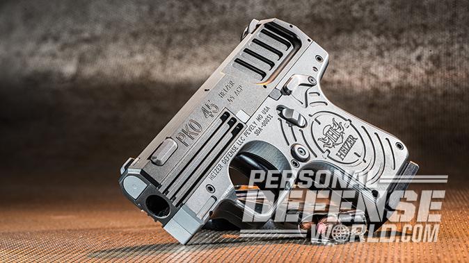 Touted as the slimmest semi-auto .45 ACP out there with a width of 0.8 inches, the Heizer PKO-45 was first introduced at SHOT Show 2016. The gun weighs in at around 25 ounces and is made of stainless steel, with no plastic or “mimed parts” to be found anywhere, the company says. It features a fixed-barrel-under-the-guide-rod configuration, which reduces felt recoil. It also boasts a snag-free design; internal hammer/single action; and a front strap safety with an additional ambidextrous thumb safety.
