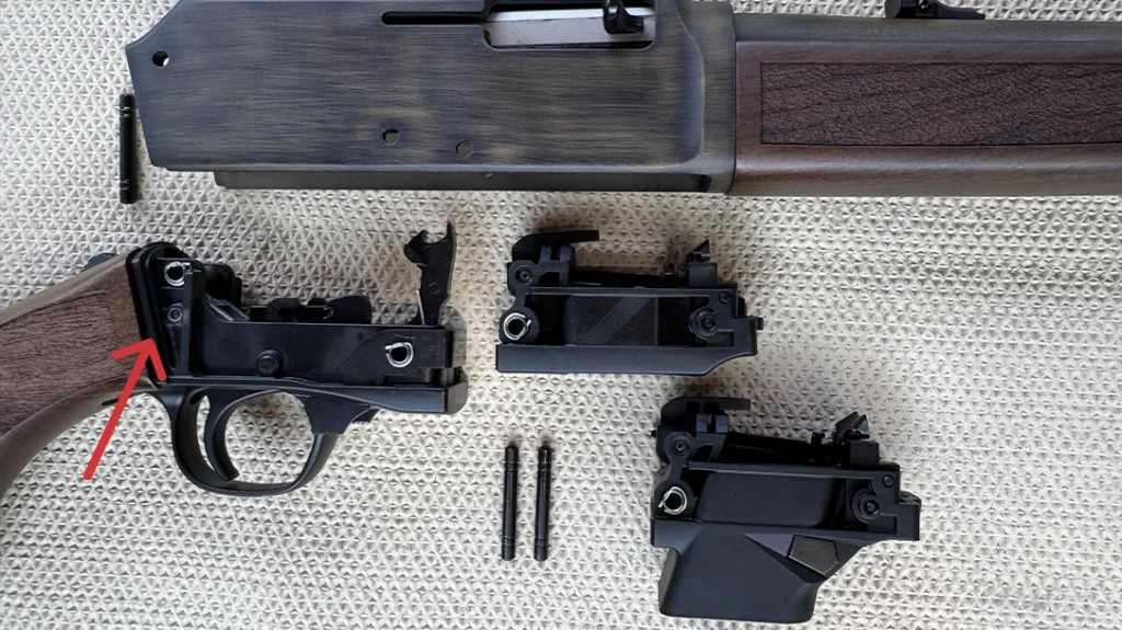 Using third-party magazines with the Henry Homesteader is accomplished driving out three cross-pins in the receiver. Then the trigger group/butt-stock assembly can be removed. There’s a groove in the rear of the trigger group that secures the butt-stock via a corresponding rail inside the rear of the receiver. Pop the magazine well front tab out of the receiver and swap out the different magazine wells; then reassemble in reverse order. Keep in mind that each style of magazine has its own magazine well. I have a vast supply of 9mm Glock magazines, so that’s the direction I took. With the Glock mag well, the release catch is now on the left side, and isn’t reversible.