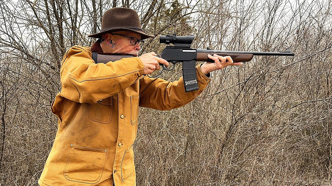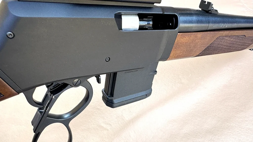 Nestled inside the black, hard-anodized, aero-space grade, aluminum receiver is a patent-pending quad bar linkage and slider crank mechanism that delivers a smooth action, which is the hallmark of HRA lever-guns. This action operates a multi-lug, rotating bolt that looks very “ARish” and provides positive lockup, extraction, and ejection. The hammer is internal, which seals the action against weather, dust, dirt, and debris. Like all Henry lever-guns, the Supreme Rifle has side ejection, but a new twist is that it feeds from a detachable magazine. The rifle comes with a 10-round MagPul PMAG magazine, which includes a 5-round limiter, to comply with certain state’s hunting regulations. It’s time to mention that the Supreme Rifle comes in .223/5.56 NATO or .300 BLK versions. My test rifle was in .223/5.56mm.