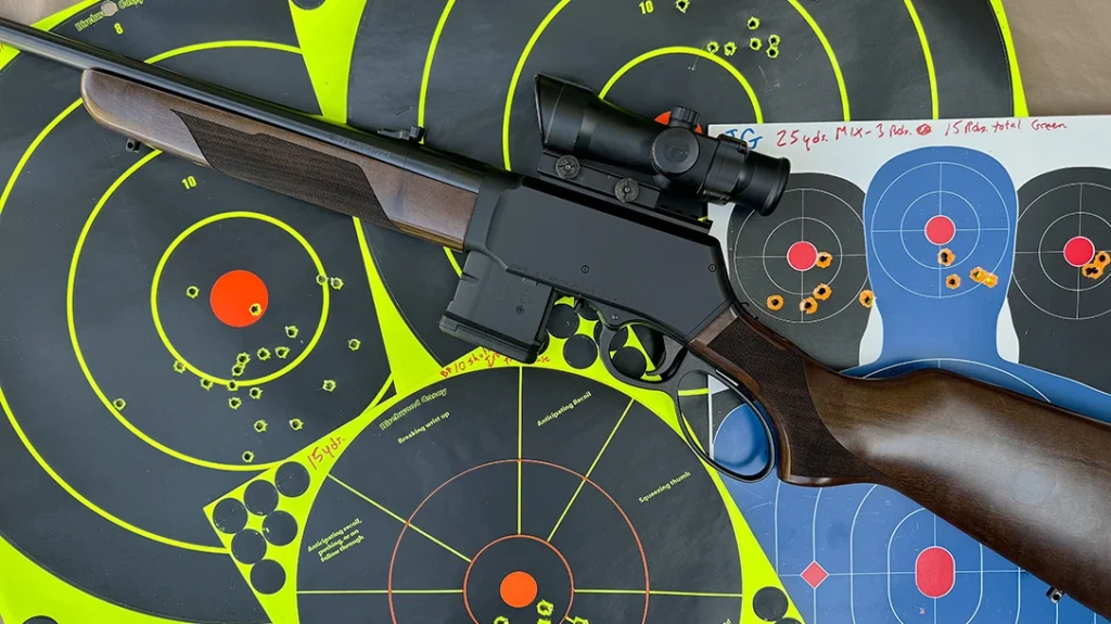 I first laid eyes on the Henry Repeating Arms (HRA) Lever Action Supreme Rifle during Industry Day at the Range, preceding the 2024 SHOT Show. My first impression was that it looked “retro-cool.” Its blue steel, anodized aluminum and American walnut construction gave it traditional styling, and the design seemed out of the 1920’s rather that the 2020’s. It reminded me of a Browning BAR, with shades of a Model 1907 Winchester, but with a finger lever. The box magazine protruding from the bottom of the receiver might have caught the eye of Texas Ranger Frank Hamer. I shot a magazine full of cartridges from it at the range event and afterwards requested a test sample. It showed up on my doorstep in February 2025. Now to see if it was worth the wait.