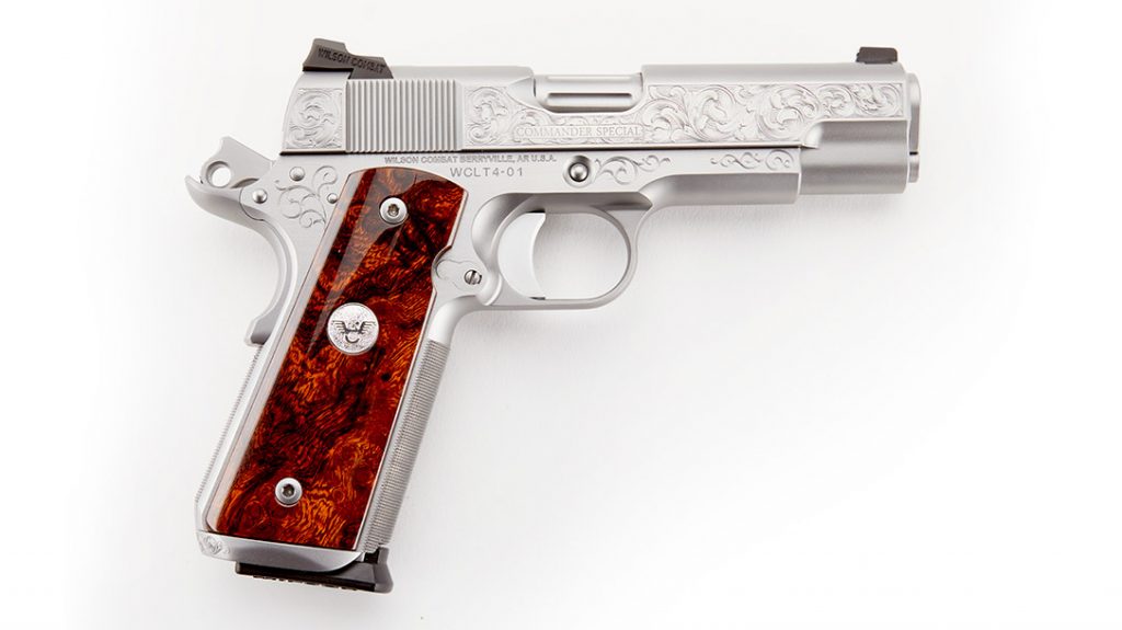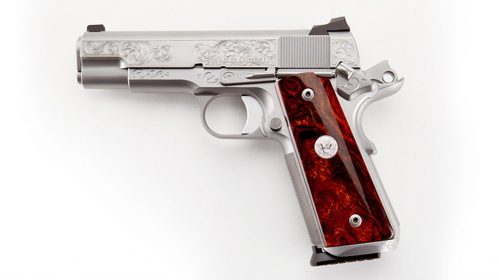 This beautiful nickel-finished 1911 has had every part of it carefully planned out and built. The gun has a professional-size stainless steel frame and 30 LPI high-cut checkered frontstrap. It also has the Wilson bulletproof round magazine well, high-ride bulletproof beavertail grip safety and a commander hammer. The beautiful, detailed engraving is done by FEGA Master Engraver Layne Zuelke of Southern Custom Engraving. His skilled hands have added a level of art to this solid shooter that is almost beyond compare. The gun is just short of 8 inches in overall length and is designed not only to be admired but shot if the owner should feel the urge: Wilson includes their “1.5-inch groups at 25 yards” guarantee. If you can be the first in line to get this newest member of the Limited 10 family, it will set you back around $8,900. For more information, visit WilsonCombat.com.