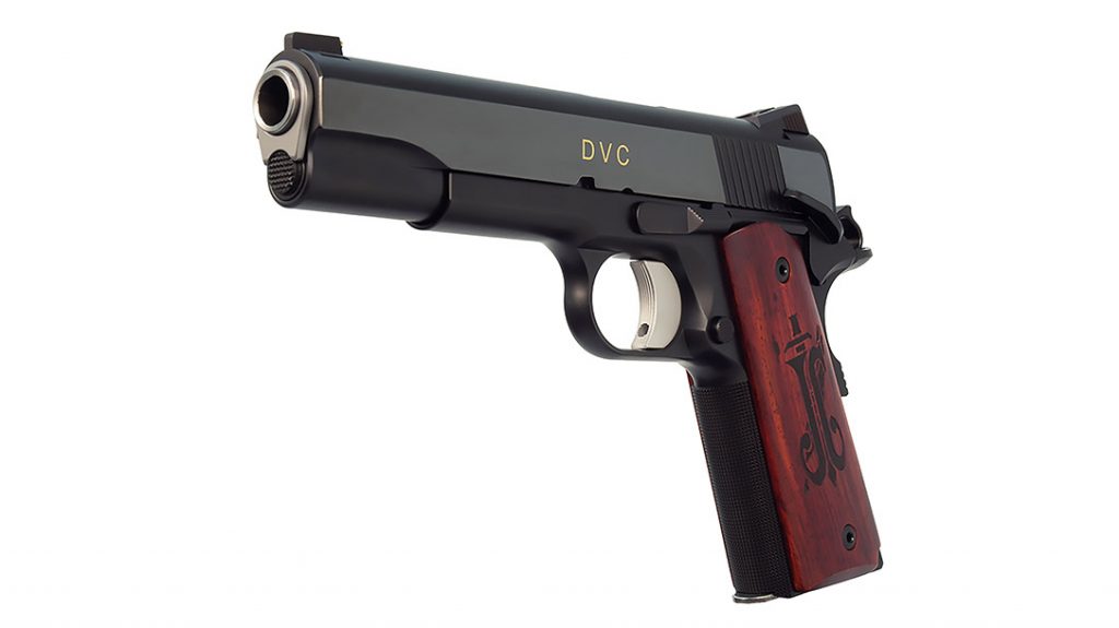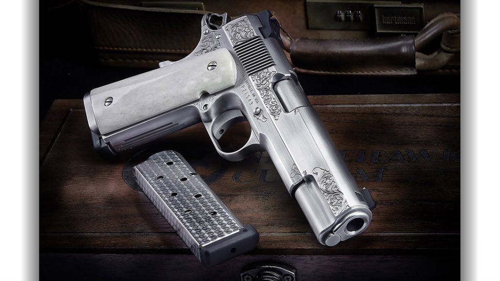 The righthand side of the slide is inlaid with “DVC” in 24-karat solid gold, which stands for the Latin phrase, “Diligentia, Vis, Celeritas,” meaning, “Accuracy, Power, Speed.” Complete with a concealed-carry beavertail grip safety and exhibition-grade cocobolo smooth grips with the engraved Jeff Cooper logo of the pen and sword, it is subtly beautiful. The price on this masterpiece tops out at just over $3,100, making it the most “affordable” on our list. For more information, visit EdBrown.com.
