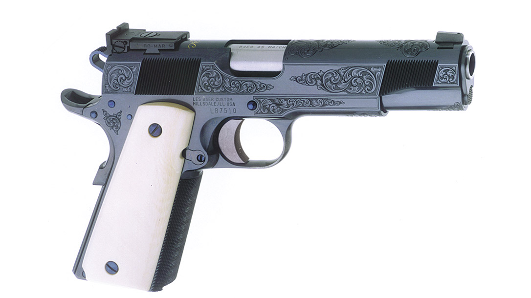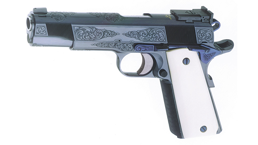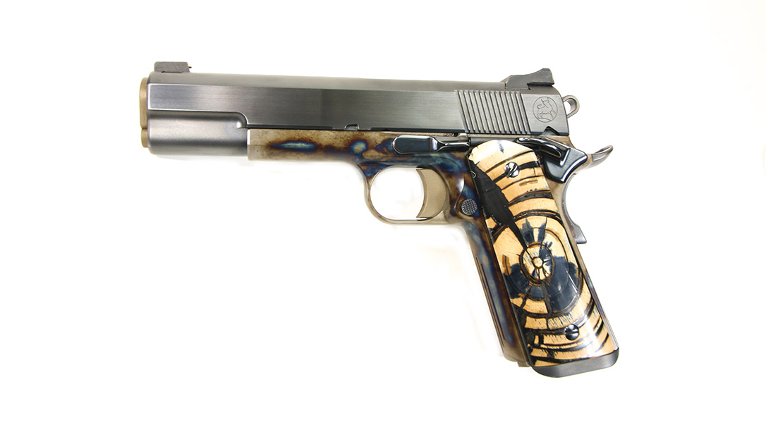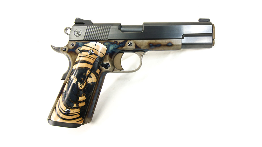 Because of the time and skill that is required to give this 1911 its unique appearance, it is very limited in availability. This pistol is crafted with all the finest customizations, including a classic case-hardened and polished frame. The Turnbull high-polished blued slide matches the slide stop, magazine release and thumb safety. To top it all off, they added a 14-karat solid-gold bead front sight, mammoth ivory grips and a custom case.