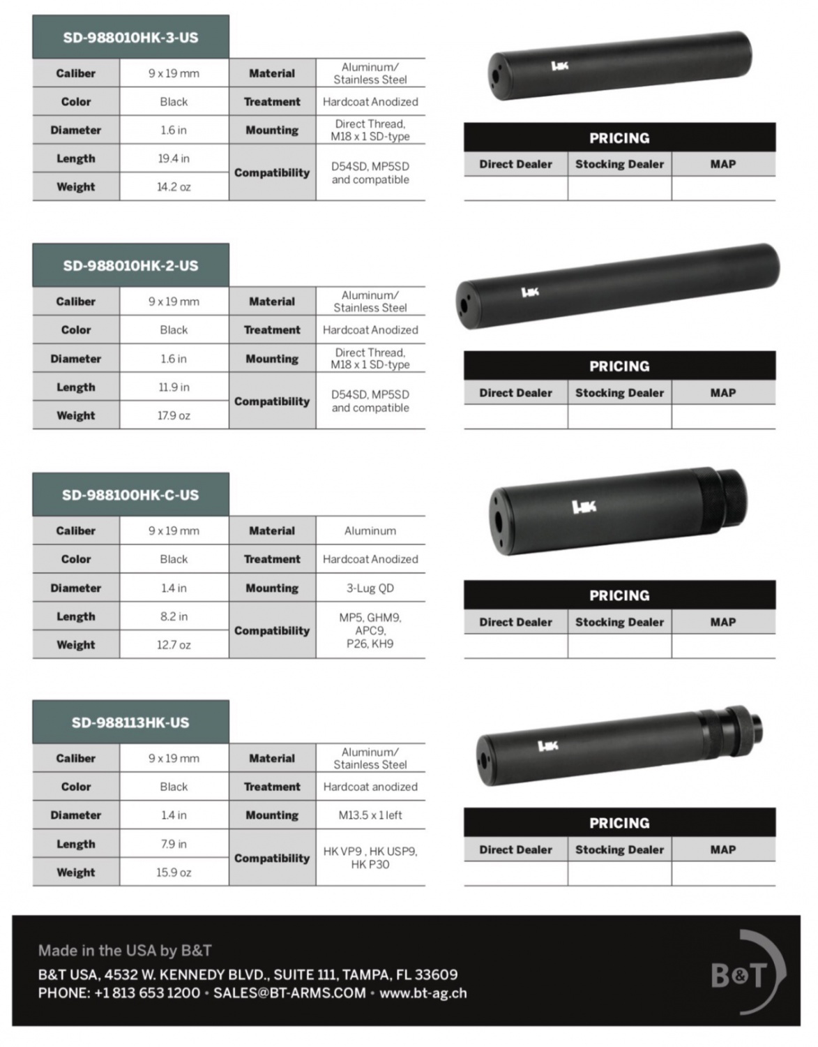 The initial rollout of these HK-branded suppressors from B&T will include models for pistol caliber handguns, PDWs and carbines, with suppressors for rifle calibers to follow. According to a couple of product images (click below to enlarge) supplied to The Firearm Blog, it looks like there are seven options for shooters to choose from.