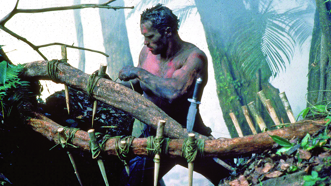 Since he’s a former Green Beret and Vietnam vet, it makes sense that Rambo utilizes a number of booby traps the Viet Cong used in their tunnels during the war. The dark twists and turns are filled with the equivalent of punji traps, spring traps attached to such things as sharpened pitchforks and even a two-man deadfall lined with steel spikes—in addition to tripwires attached to grenades, homemade explosives and even one attached to a drawn compound bow mounted to a bracket inside a doorway.