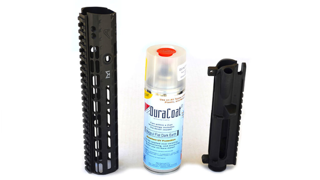 I wanted the upper receiver and handguard to match the flat dark earth finish of my Wilson Combat lower. So, I used an aerosol can of DuraCoat® to coat the parts. DuraCoat® doesn’t require heat to prep or cure the finish, and the can has its own catalyst or hardener. This gives the user about 24 hours to use the can.