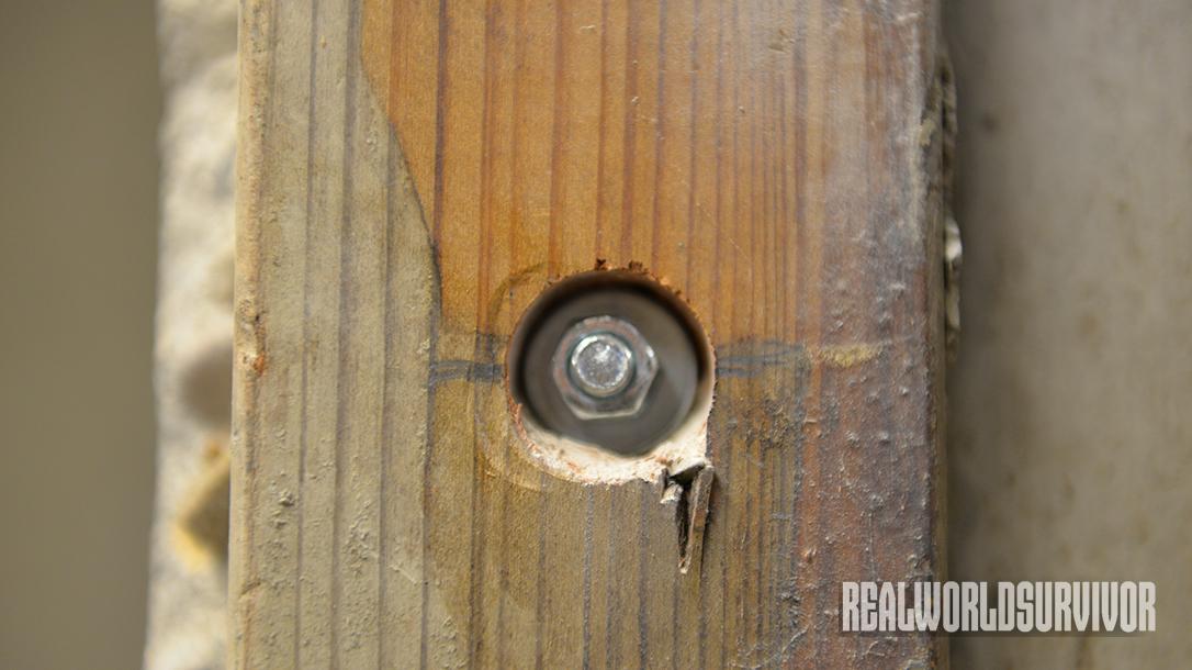 Once in place, things get much easier. The Hornady SnapSafe vault door comes in its own steel door frame. With that in mind, installation is merely an exercise in lifting it into the opening and then mounting the lag bolts into the walls. In my case, the walls are concrete, which is both good and bad. Good because high-quality masonry bolts hold the frame tightly in place, but the wooden frame from the poured concrete walls was not perfectly square.