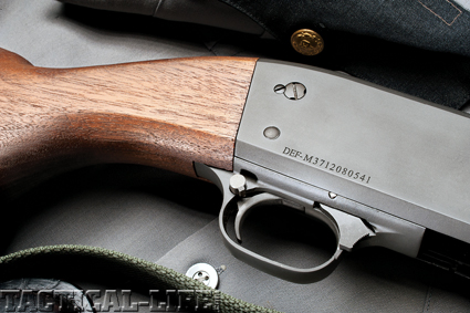 The Ithaca 37 Defense features fine CNC machining, with a pushbutton safety at the rear of the triggerguard and slide release tab at the front.