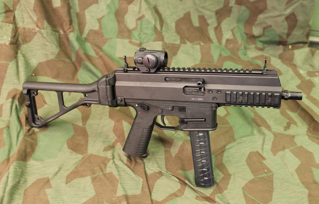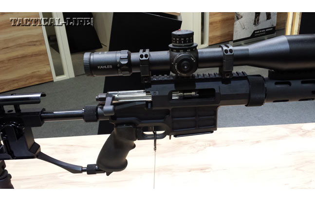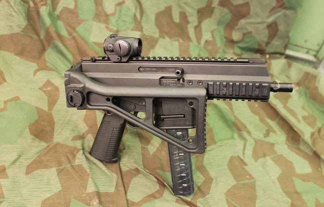 B&T APC Assault Rifle: Swiss firm B&T (formerly known as Brugger & Thomet) had several unique guns in its booth. The pistol-caliber APC “patrol carbine” was intended for the LE market. This was developed further into the newly released APC assault rifle, featuring a short-stroke gas piston operating system and a side-folding stock, available in 5.56mm and .300 Whisper. It looks similar the Heckler & Koch G36 design, with a beefy Stoner-style bolt and heavy carrier. The polymer lower receiver is a one-piece design housing a full set of ambidextrous controls. B&T owner Karl Brugger informed me that the company has three different stock designs available as well as a variety of forend and gas block options. It is available in full-size, SBR, semi-auto and select-fire versions depending on who is making the purchase. It uses standard AR-15/M16 magazines. B&T is currently reviewing its options for the U.S. commercial market.