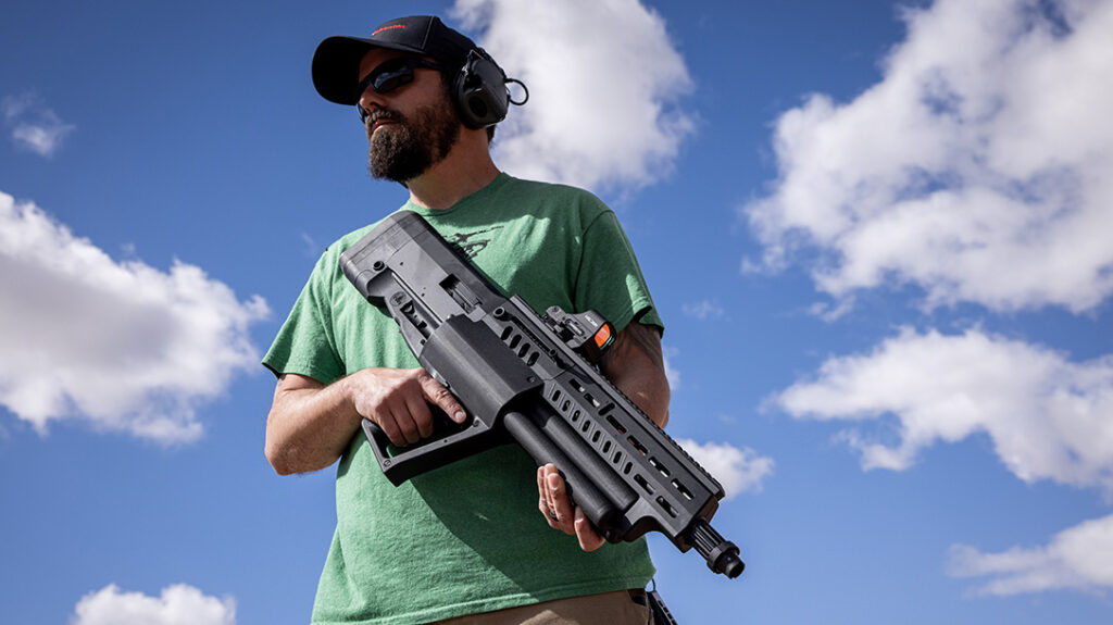 The need for a versatile, high capacity, and mobile shotgun is always a challenge. Shotguns tend to be long, and the more they hold the longer they get. The longer they get the more unwieldy they become if space is at a premium. A long barrel and swing can be an asset on a bird or clay gun, but what if you need to move a lot of shotgun into a little space? Well, you could probably use a bullpup. A bullpup that holds three times the normal shotgun capacity wouldn’t hurt either.