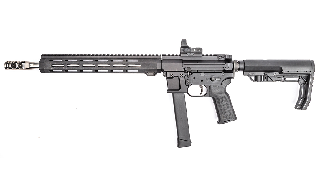 The gun looks about like most AR-style PCCs, but it boasts an ambidextrous bolt release, mag release, safety selector and Radian Raptor charging handle. You are sometimes forced to shoot from both shoulders in some competition stages, so these are great features. It takes Glock 9mm magazines and has last round bolt hold open. Mission First Tactical’s BATTLELINK Minimalist Stock works great on it, and Magpul’s MOE-K2 pistol grip is more vertical than normal grips, which pulls the shooter’s elbow down and in tight to the body.
