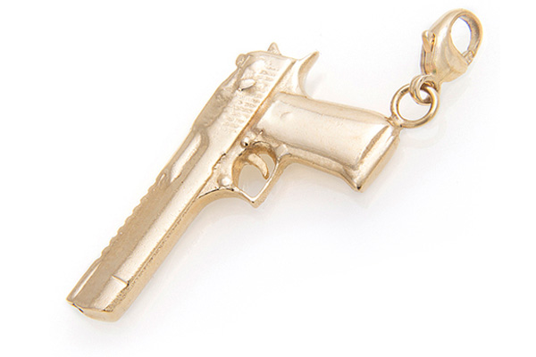 The Desert Eagle charm is crafted in 14 karat yellow gold, the charm has a polished finish and all the details of a real .50 cal. Desert Eagle. Charm features a lobster claw clasp to attach to any charm bracelet or necklace. Approximate weight 5 grams.