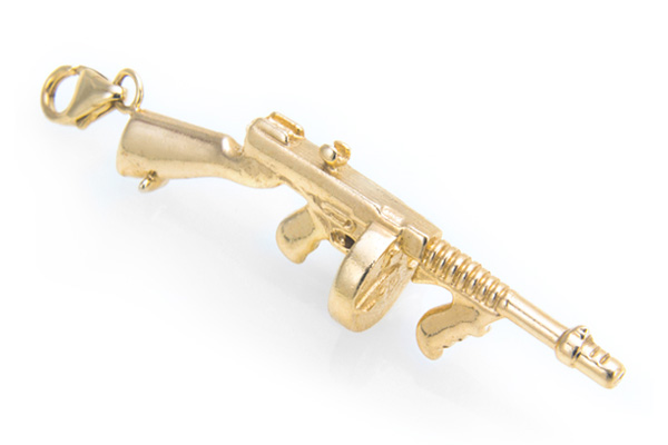The Thompson Rifle charm is crafted in 14 karat yellow gold, the charm has a polished finish and all the details of are Thompson 1927A-1 short barrel rifle including the drum magazine. Charm features a lobster claw clasp to attach to any charm bracelet or necklace. Approximate weight 6 grams. The new jewelry collection by Kahr makes for a perfect Mother’s Day, Father’s Day or holiday gift.