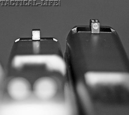Front night sight module on TP45, right, was a tad dim compared to the one on 9mm counterpart, left. Author has found this unusual for both Kahr and Trijicon.