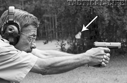Arrow shows spinning .45 brass from last shot, but author already has the TP45 in line for the next shot. Recoil is controllable despite light weight.