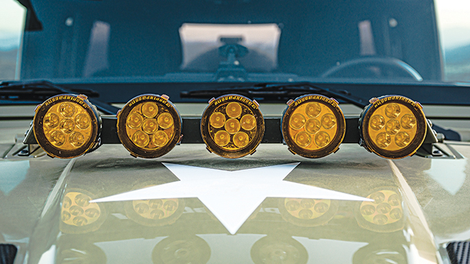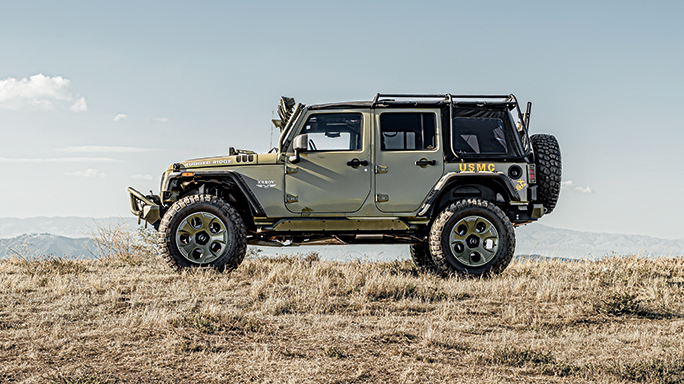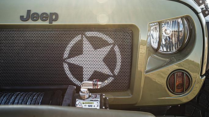 Speaking of Kilroy—the military-themed Jeep you see here—it almost didn’t make it onto these pages. Built by Rugged Ridge, Kilroy was created for last year’s SEMA Show, a trade event devoted to presenting the latest and greatest automotive aftermarket goods. So, you know, it’s a place to check out everything from Batman-themed floor mats and LED windshield wipers to bearded old men whose idea of fashion is a Hawaiian shirt covered in ’57 Chevys.