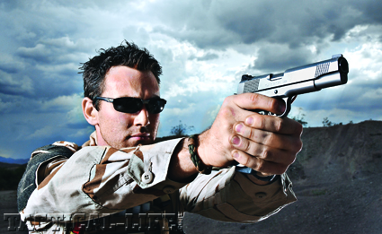 For defense work, the sights are fitted with tritium lamps in the familiar 3-dot pattern. They glow green in dim light and are dovetailed into to the slide. The rear sight is drift adjustable for windage. The sights are big enough that I had no problem getting a crisp, clear sight picture when shooting groups at 25-yards.