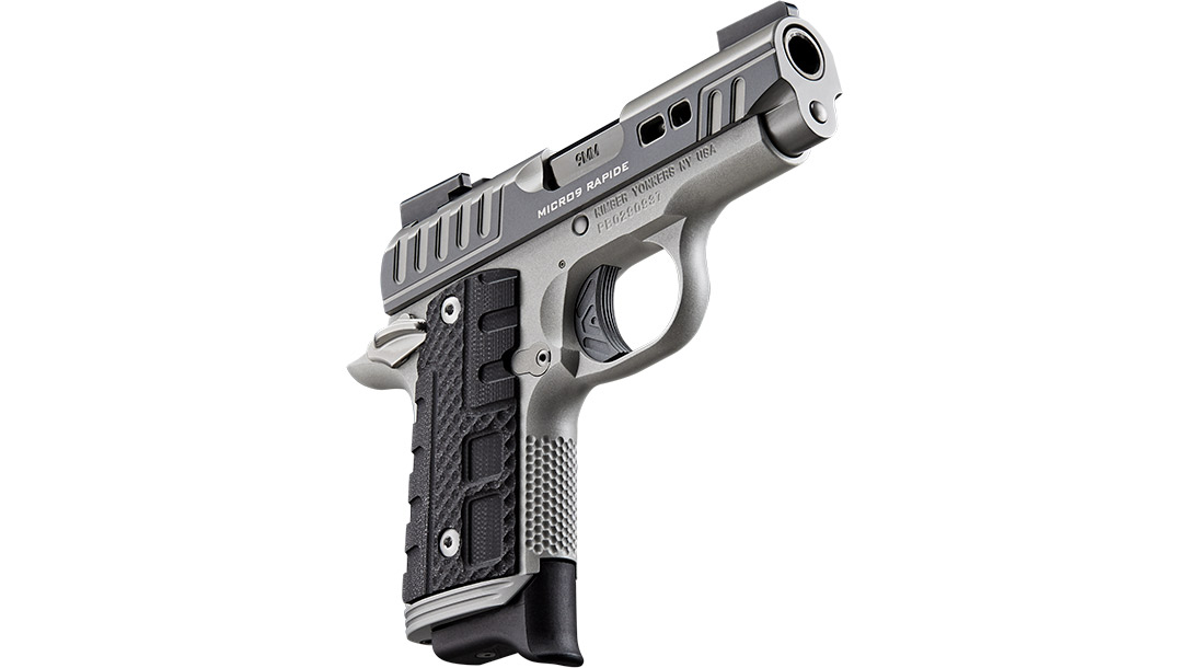 Kimber machines the Micro 9 Rapide’s frame from aircraft grade aluminum alloy for weight savings. With an unloaded magazine, the gun’s weight is just 15.6 ounces! The pistol features ambidextrous manual thumb safeties and a mainspring housing that features oblong cuts to complement the slide cuts.