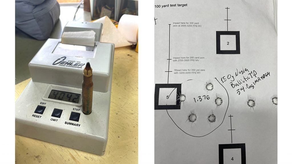 I keep an ample supply of 125-grain .308 projectiles around for loading 300 AAC Blackout, so decided to give the Nosler Ballistic Tip 125s a whirl in the .30-06. IMR 3031 has been my “go-to” for .30-cal loads for bullets in this class. The maximum charge in Speer’s manual is listed as 54.0 grains, but this rifle preferred a lighter charge of 51.6 grains of 3031 to yield good accuracy. The average velocity was 2,910 fps.