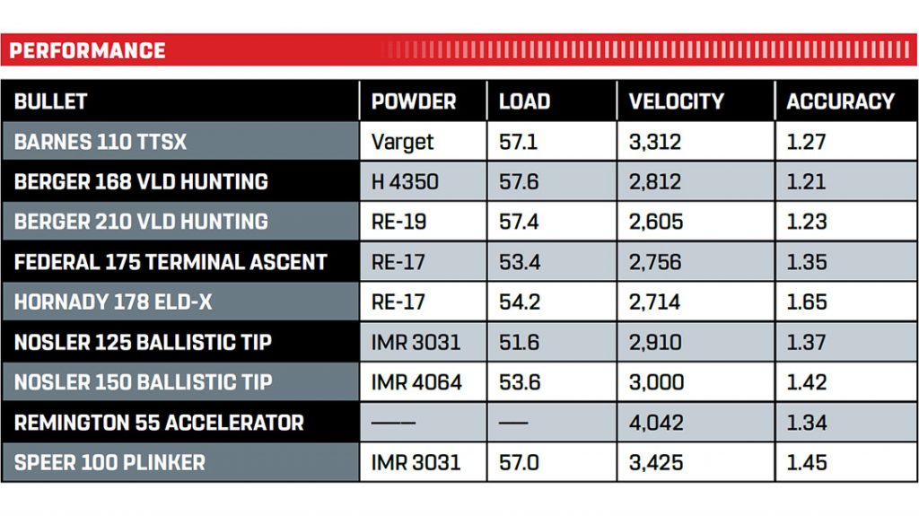 To see how versatile this rifle actually is with a wide variety of bullet weights, I started heavy and moved progressively lighter to culminate with an accurate, lightweight load. I used a mix of handloads to show versatility.