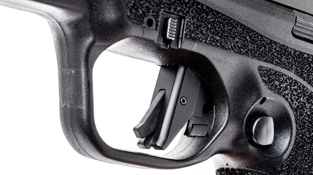 Frame material is polymer plastic that gets a molded stippling treatment. This pistol is “grippy,” and feels good in the hands. Magazine choice also comes into play if you’ve got big hands.