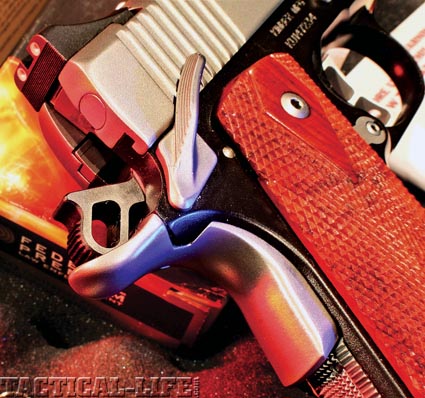 The frame is machined from a lightweight 7075-T7 forging and features a beveled magazine well and 30 line-per-inch checkering on the frontstrap and on the underside of the triggerguard. The frame’s matte black KimPro II finish is offset by stainless small parts: ambidextrous thumb safeties with extended serrated pads, a high-swept beavertail grip safety, a slide stop and magazine release with checkered pads, a slotted and serrated commander-style hammer, and a lightweight aluminum skeletonized long trigger with a serrated face that can be adjusted for overtravel. A polymer, flat-checkered mainspring housing enhances the grip.