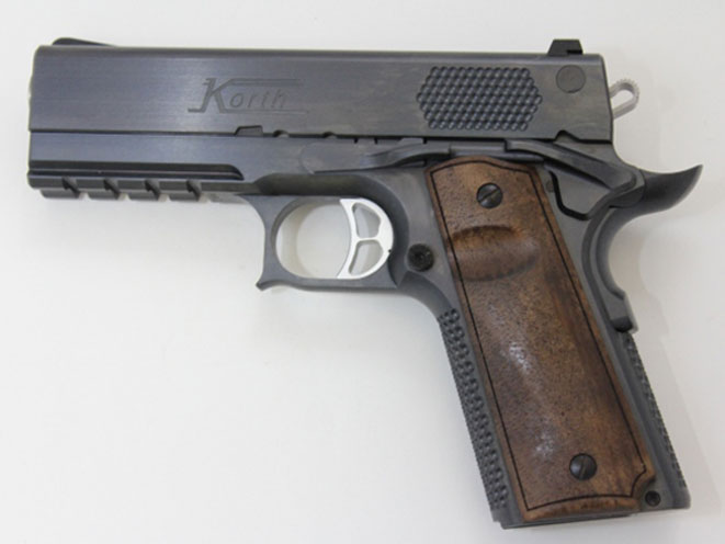 German-based luxury gun manufacturer Korth Arms has several exciting releases coming up in 2015, including the PRS, a 1911-style semi automatic pistol with a roller locking system and fixed barrel in .45 ACP. Available in four, five and six-inch barrel configurations, the Korth PRS has a seven-round magazine capacity, a hardened carbon steel frame and slide finished in traditional blueing, PVD coating and Cerakote, a dark walnut wood grip, and an overall length of 7.67 inches through 9.64 inches. The MSRP has not been officially announced, but a report on The Truth About Guns suggests this pistol will be available for $3,000. See below for additional details, including two videos featuring this product.