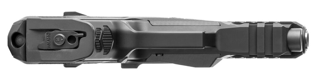 Other frame features include a dust cover with integral Picatinny rail, plus a low-profile slide stop and magazine catch. The manual safety levers are rather small and pivot at the front. When in the up position, it is “on-safe,” and the down position exposes a red dot and makes the pistol ready to fire.