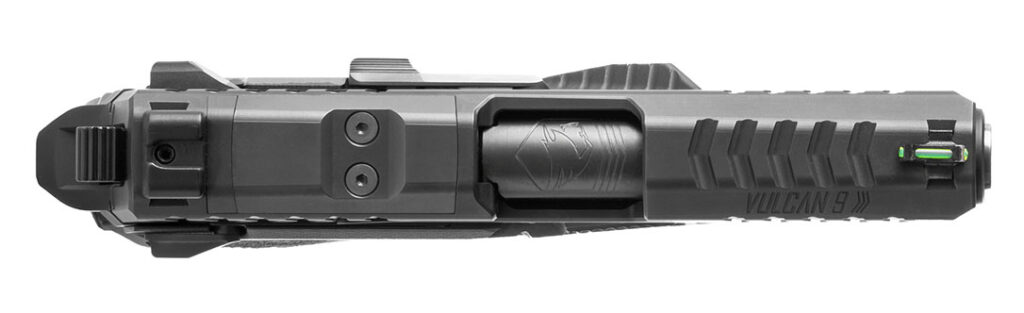 The Vulcan 9 slide is also optics-ready, with a cover plate in place. No adapter plates are needed, and the screw pattern accommodates dot sights with the Shield RMSc or Trijicon RMRcc footprints.