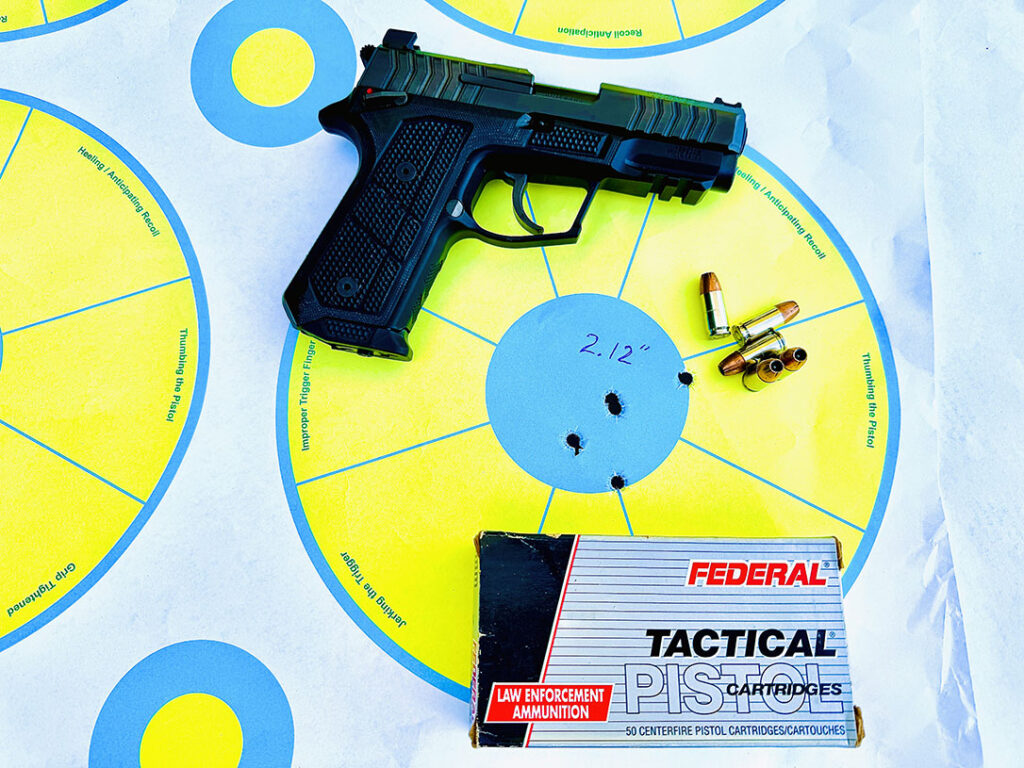 Of the five 9mm test loads, the most accurate proved to be the old Federal Tactical with the 147 gr. Hydra-Shok JHP. One 5-shot cluster measured 2.12 inches, and the 3-group average was 2.33 inches.