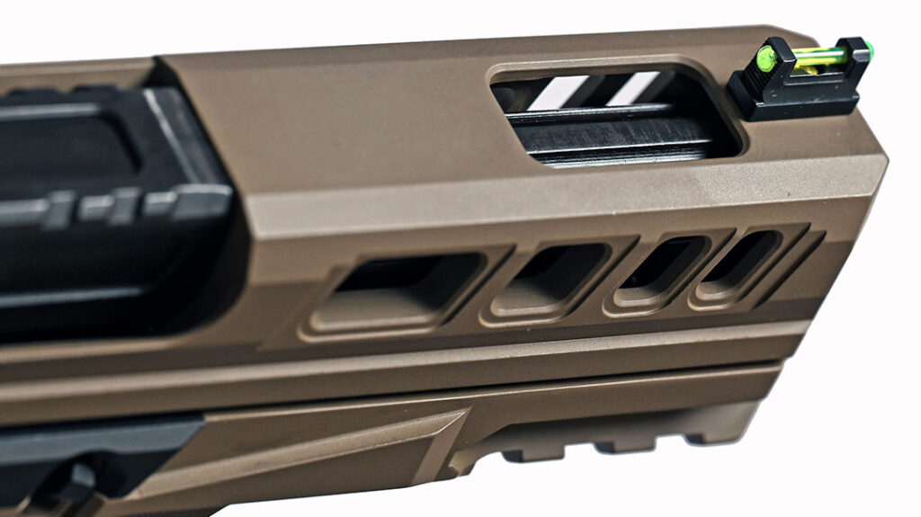 Moving to the slide, Live Free Armory didn’t take the easy way out here either. You get a very attractive slide with stepped quad windows and nice, deep, aggressive serrations front and back.