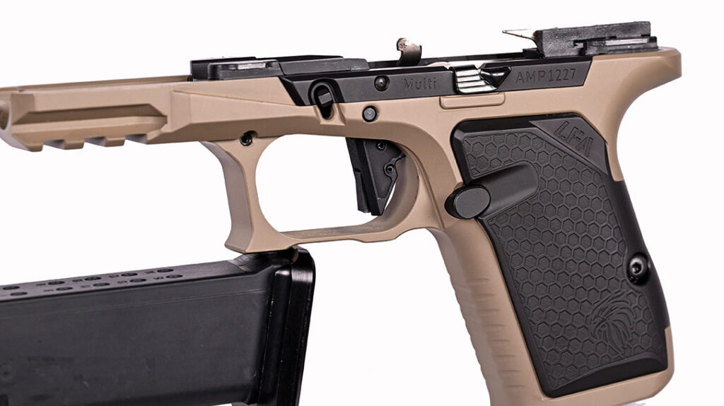 This aluminum Match-Grade Pistol (AMP) has a fire control unit, much as you see on the Sig P320. Thus making the system extremely modular. The FCU is precision CNC-machined out of heat-treated 416 Stainless Steel. This allows for very tight tolerances and a near-seamless edge when sitting in the aluminum frame of the AMP.