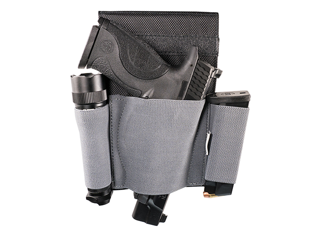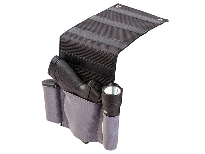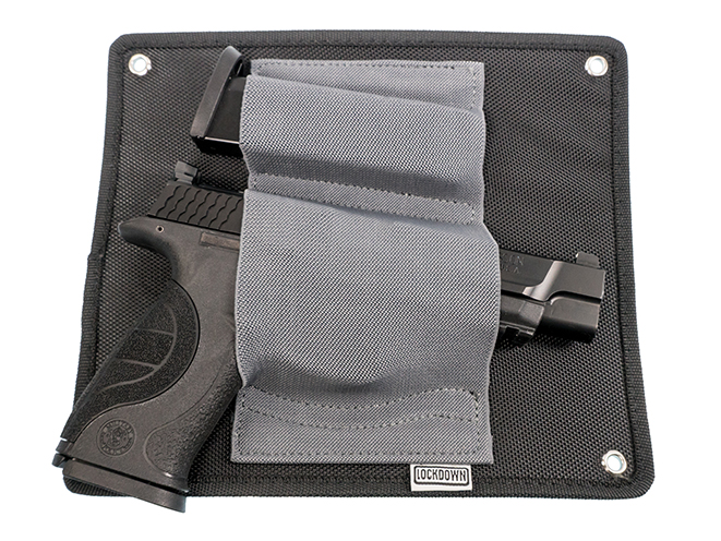 The first offering is the Lockdown Under Desk Holster. This product is a 4.25-inch wide elastic holster that mounts — with four screws — underneath nearly any desk. It’s capable of holding a range of handguns, from compact semi-autos to full-frame revolvers. It’ll also hold a spare magazine or flashlight. Built for ambidextrous use and made of re-enforced backing for rigidity, the Under Desk Holster gives you quick and easy access to your firearm. The overall dimensions are 8.5” wide x 10” long x .125” thick (unloaded). The suggested retail price is $23.99.