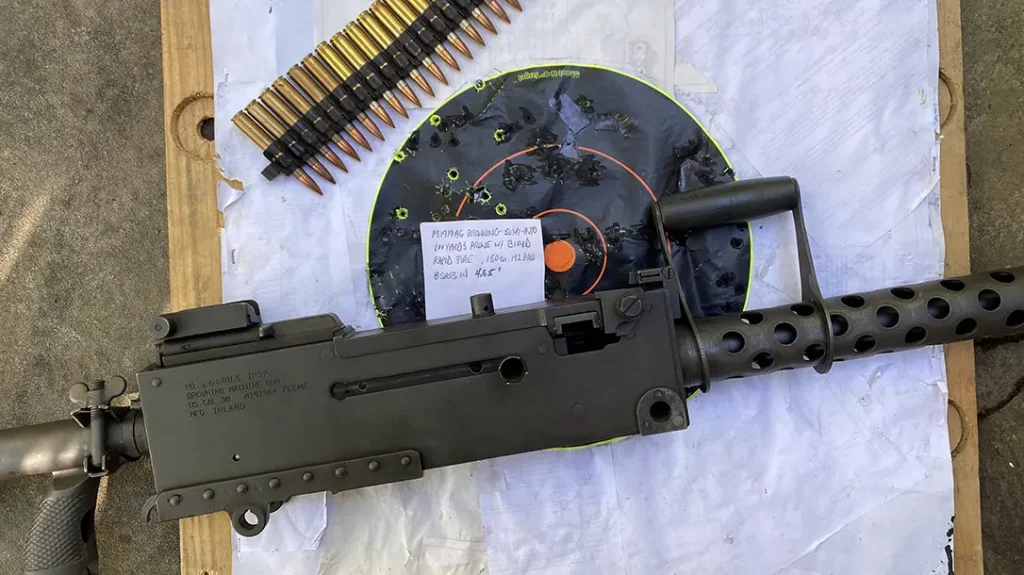 The really eye-opening experience came at the end of my test in a rapid-fire experiment where I burned through a 25-round belt as fast as I could pull the trigger. My semi-auto cyclic rate turned out to be 176 rounds per minute, a far cry from the 400-450 rounds per minute that a full-auto gun is capable of. Even at my kindergarten cyclic rate, I began to feel what I’d describe as the gun’s rhythm, rocking back and forth as the action went in and out of battery with each shot.