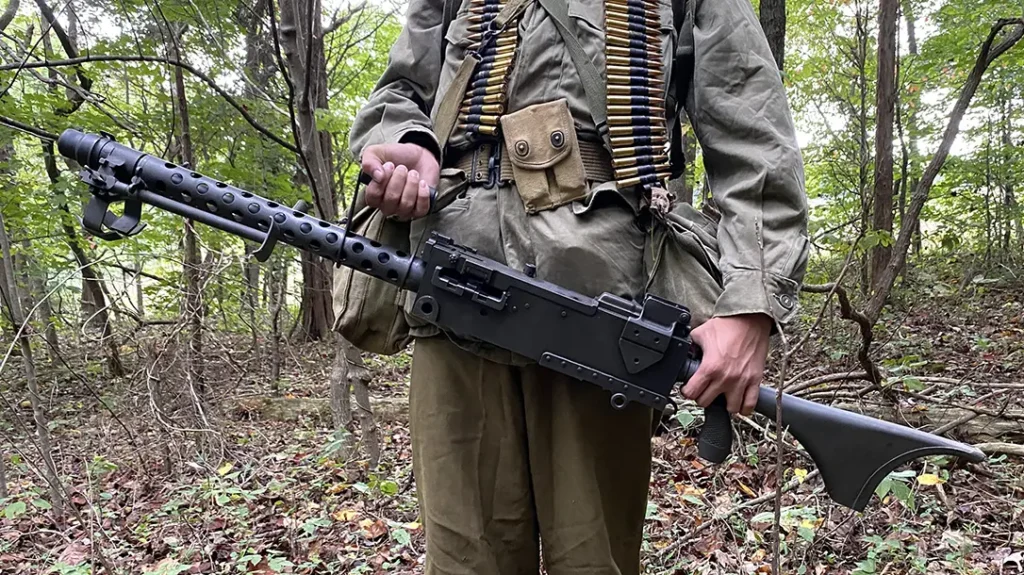 If you watched HBO’s World War Two saga “Band of Brothers,” you may recall the Browning 1919A6 Light Machine Gun making its appearance in the Bastogne episodes. It was a stop-gap gun that looked a bit like what you’d get if you crossed a M1919A4 belt-fed light machine gun with an M1918A2 Browning Automatic Rifle (BAR). If the light machine guns of World War Two went to a dance, the M1919A6 would be the badly dressed fat kid with two left feet who struggled just to get onto the floor while the British Bren, German MG34, Japanese Nambu Type 99 and Russian DP-27 were doing the Jitterbug.