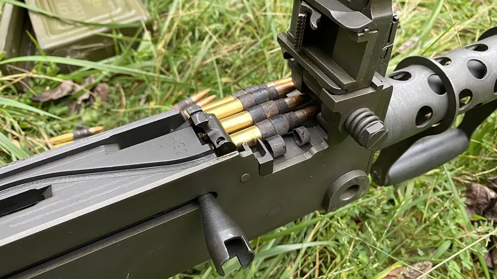 The initial pull advanced the first cartridge in the belt into the loading position directly in front of the bolt. The second pull stripped that cartridge from the belt, lowered it to the level of the barrel, chambered it, and positioned the next cartridge in the belt for loading. There’s a lot going on mechanically inside these guns and you can feel it when working the charging handle. You have to put some muscle into it, much more than any sporting firearm you’ll ever use. The 5-pound barrel attached to its extension inside the receiver is the greatest part of the reciprocating mass. The guns had no mechanical safety either. Once a round was in the chamber they were ready to fire. To make the gun safe, you have to open the top cover, remove the belt, and draw back the charging handle to clear the chamber.