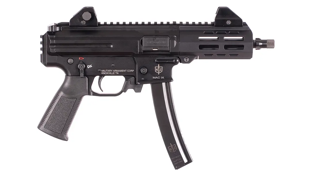 The 6.5-inch barrel incorporates a tri-lug muzzle and device and a muzzle threaded 1/2-28 for muzzle devices and suppressor use. To add to the unit’s versatility, the MAC IX features AR-style quick-takedown pins and an ambidextrous charging handle. A vertical Picatinny rail on the back of the receiver accepts a variety of stabilizing pistol brace designs.