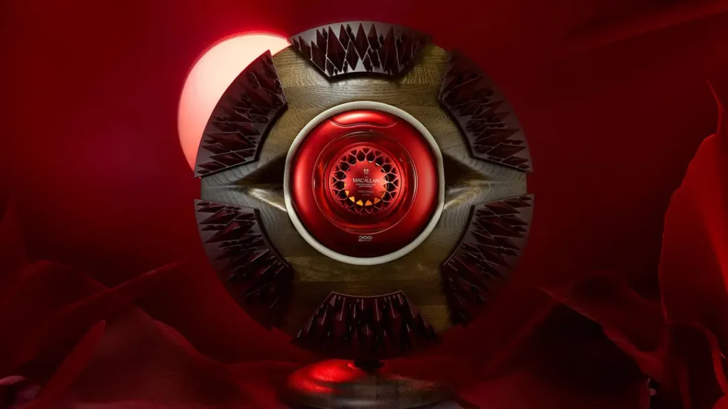 The Macallan has created two versions of their celebration offering. The first one we will look at is called Time: Space Mastery. Priced at a mere $1,500, it is the version most people will have access to. It is a combination of two bottles, each with a different Scotch. The outer halo bottle will house the 84-year-old, while the inner bottle will house another vintage. This inner Scotch was first produced at the new Macallan distillery in 2018—a combination of old and young. Of course, any special anniversary release requires its unique packaging. This decanter comes in a bright red box coated in 200 origami thorns.