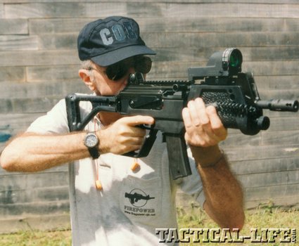 Author prepares to fire one of Para State Military Police’s Magal Carbines. It’s fitted with a Meprolight MEPRO 21-day/night illuminated reflex sight on the forward Picatinny mount