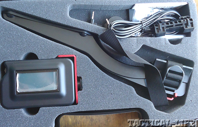 The numbers on the display are easy to see, with the usual calculations. There is a button on the side to select various functions and options. I like that you can edit out a shot if it gives you a weird reading for some reason. That way you can get rid of it and have more accurate results. The MagnetoSpeed kit I tested comes in a nice carrying case with the display unit, a retractable connection cable, a 6-foot standard connection cable, a red anodized aluminum kickstand/belt clip, thick and thin rubber V-block spacers, a Micro SD card for recording results with an adapter, the bayonet sensor, instructions, the alignment rod and a heavy-duty strap with a thumbscrew adjustment knob for securing the bayonet to the barrel.